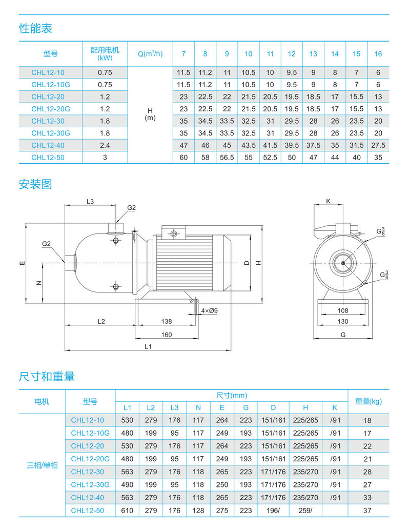 南方卧式不锈钢多级离心泵CHL12-10/20/30/40/50